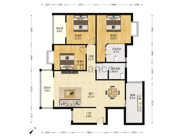 | 3室2厅 | 150.00m² | 南北 | 中装 | 住宅 |